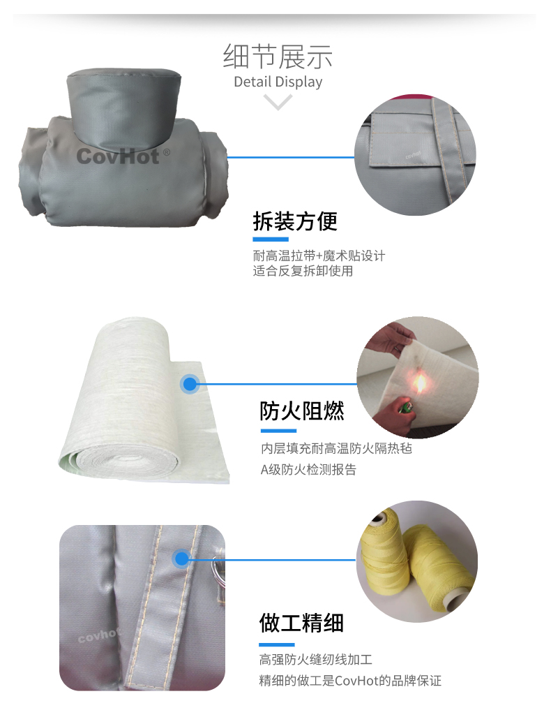 閥門內(nèi)部介質(zhì)通常為各種化工原料,柔性可拆卸閥門保溫套使用的材料可防火阻燃,能夠有效防止因介質(zhì)泄露引起的火災(zāi) ,另外閥門運行時溫度較高,易受熱膨脹,“披覆保溫”原材料柔韌性較好,能夠?qū)﹂y門的膨脹進行補償,不會出現(xiàn)保溫性能下降現(xiàn)象,有利于閥門機組安全運行,大大提高設(shè)備運轉(zhuǎn)率,增加經(jīng)濟效益;
